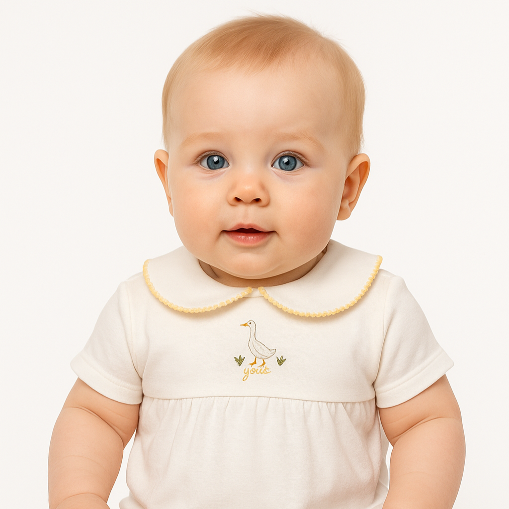 Body para bebe de 3 a 6 meses con cuello bordado y detalle de pato.