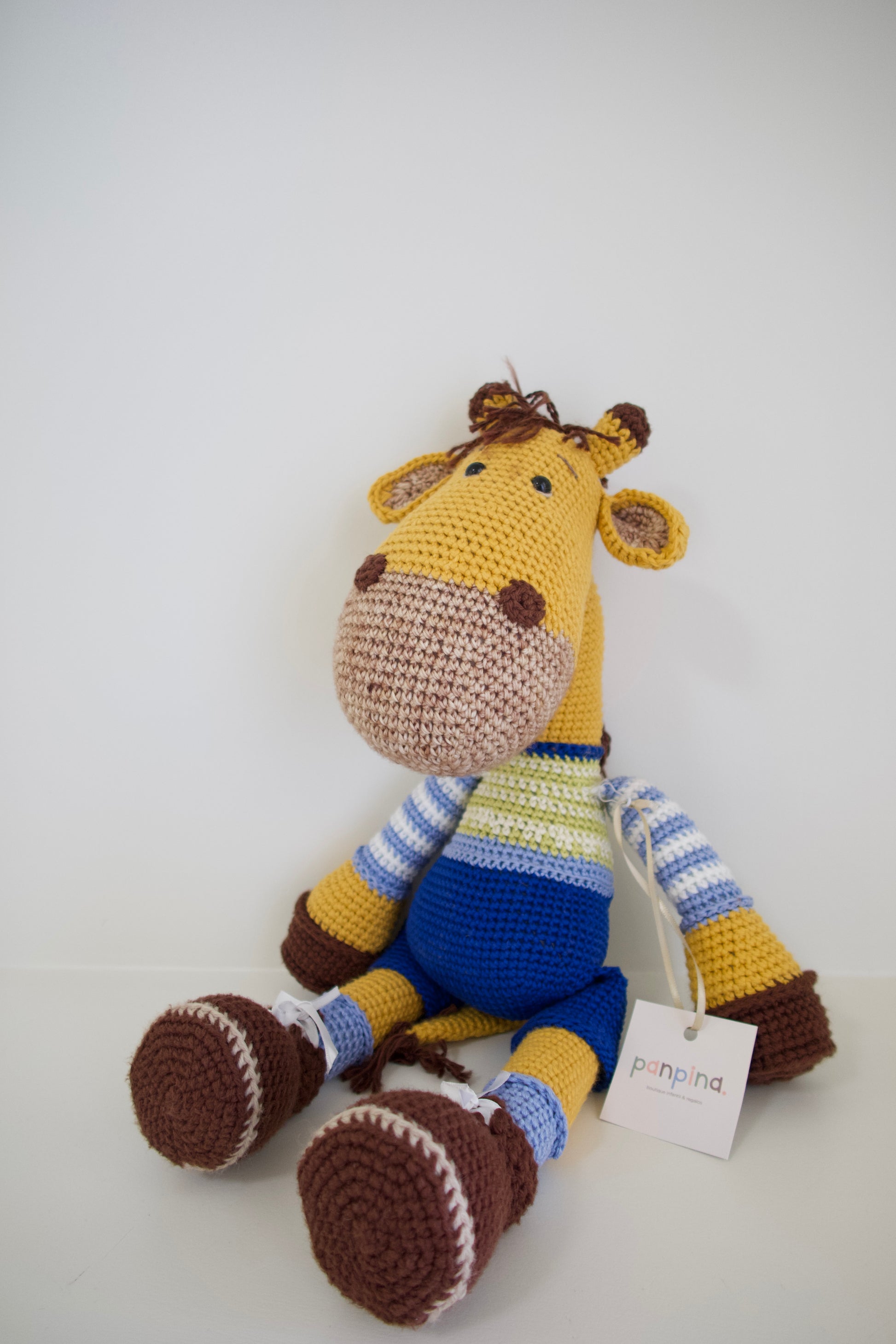 Jirafa tejida a mano con ropa azul y zapatos cafes.