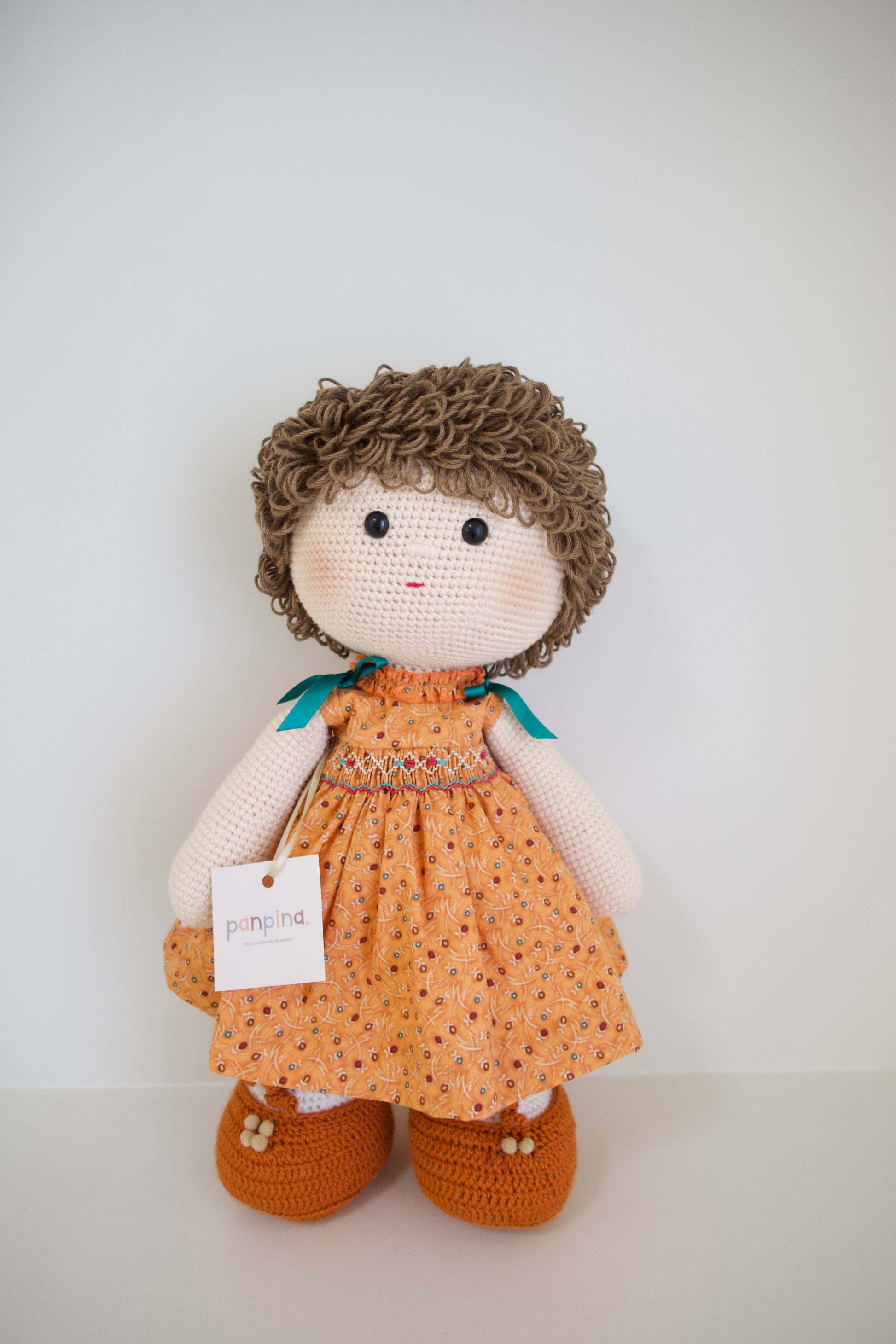 Muñeca tejida a mano con vestido naranja con moños verdes, ideal para abrazar.