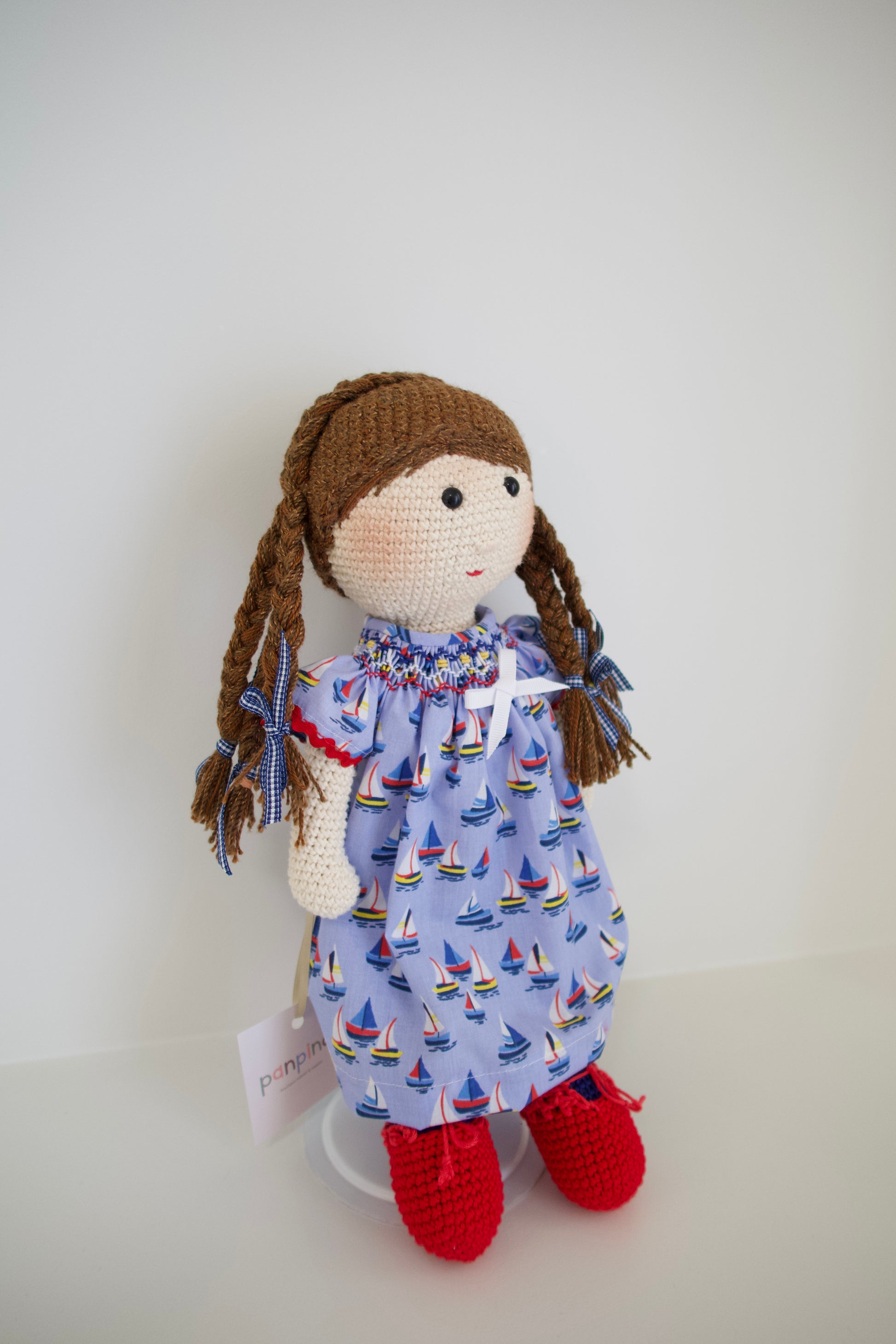 Muñequita tejida a mano con vestidito azul y zapatos rojos.